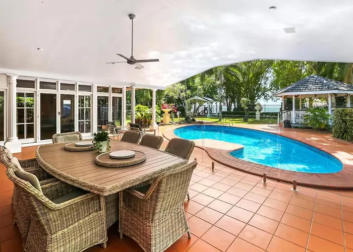 Willow Garden Stays Cairns - Beachfront 4 Bedroom Luxury Holiday Home also features an equipped kitchen and amenities such as an electric kettle, a refrigerator, and a toaster. Guests will enjoy Australian dishes in The Beach Shack, which is 350 m from the property. Cairns International airport is situated 25 km away, while Gannet Street at Coolangatta Close bus station is within a few blocks of the holiday home.